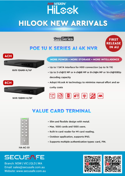 𝗛𝗶𝗟𝗼𝗼𝗸 𝗡𝗲𝘄 𝗔𝗿𝗿𝗶𝘃𝗮𝗹𝘀 | 𝗙𝗶𝗿𝘀𝘁 𝗥𝗲𝗹𝗲𝗮𝘀𝗲 𝗶𝗻 𝗔𝘂𝘀𝘁𝗿𝗮𝗹𝗶𝗮 SecuSafe proudly introduces the new Hilook Pro‑Series [POE 1U K-Series AI 4K] NVRs— combining more power ...