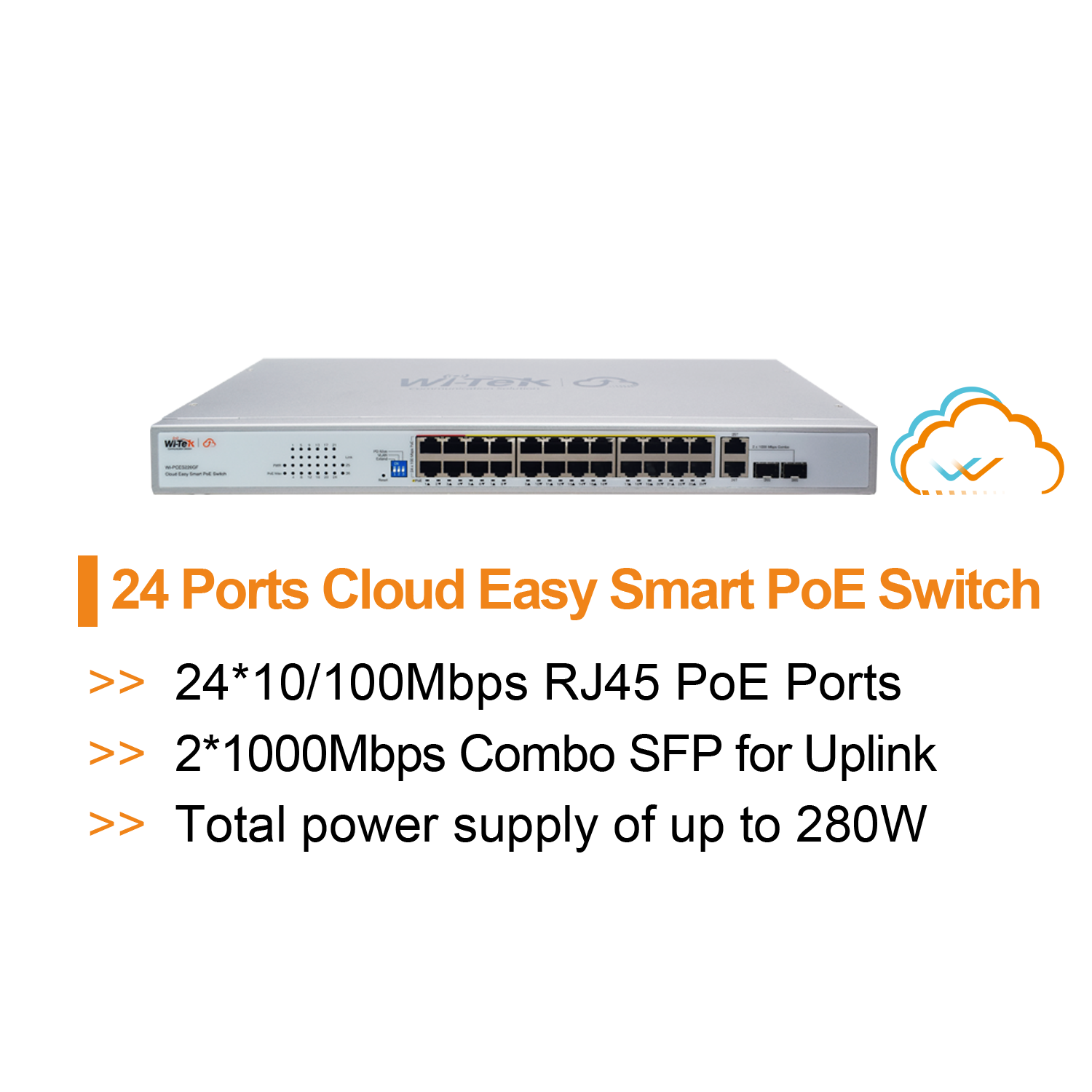 Wi-Tek 24×10/100Mbps RJ45 PoE Ports + 2*1000Mbps Combo SFP Cloud Easy Smart PoE Switch